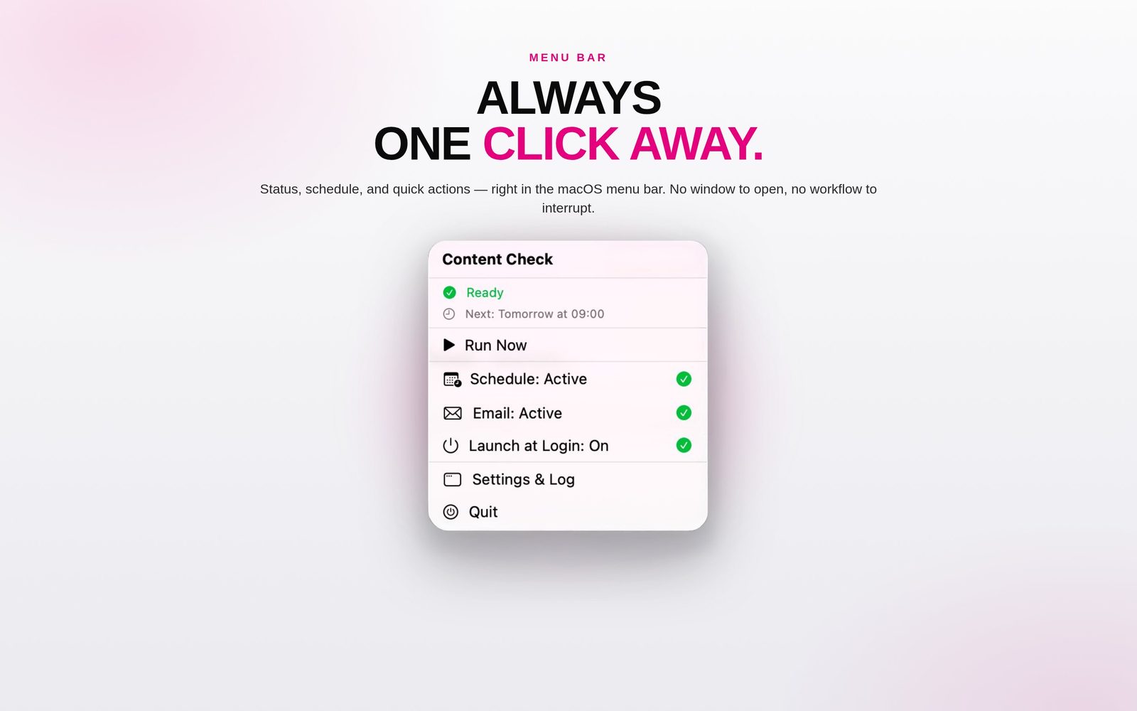 Status, schedule, and quick actions — right in the macOS menu bar. No window to open, no workflow to interrupt.