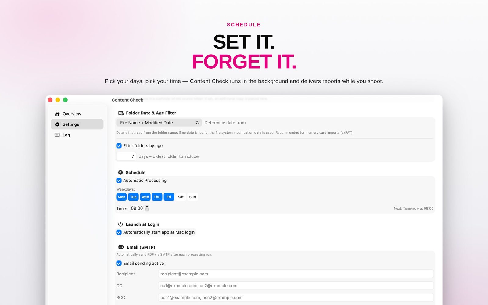 Pick your days, pick your time — Content Check runs in the background and delivers reports while you shoot.
